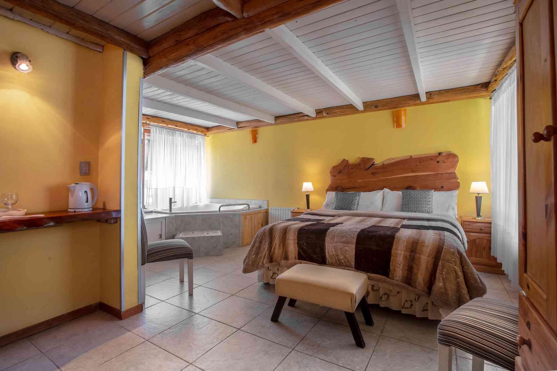 La suite Ñire es amplia y cuenta con cama King size, baño completo con bañera y calefacción central. Vistas al Cerro Currumahuida.